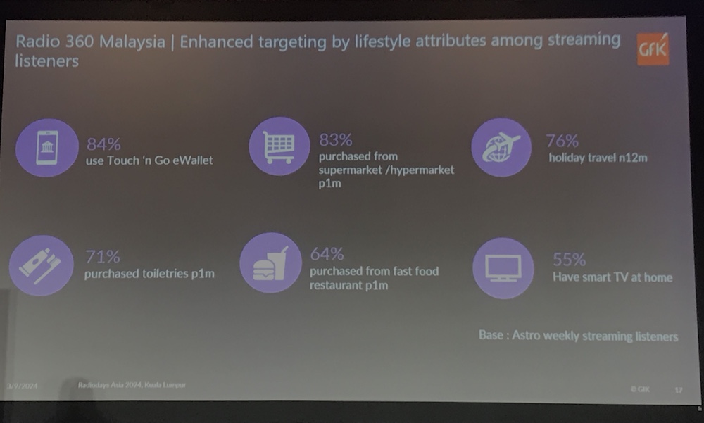 GFK Radio 360 Malaysia, has brought together both the current measurement diary system and streaming data from station server logs to provide information on AM/ FM and streaming audiences. This allows for additional media platforms to be measured more accurately than previously.